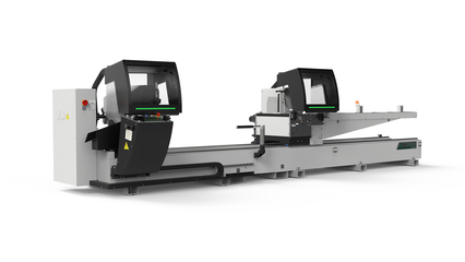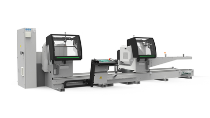 - Doppelgehrungssäge mit gesteuerter Bewegung des verfahrbaren Kopfs und elektronisch gesteuerter Neigung der Köpfe.